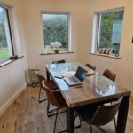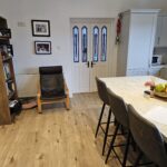 Dining New Fitted kitchen, wood flooring, wood ceiling with recess lighting